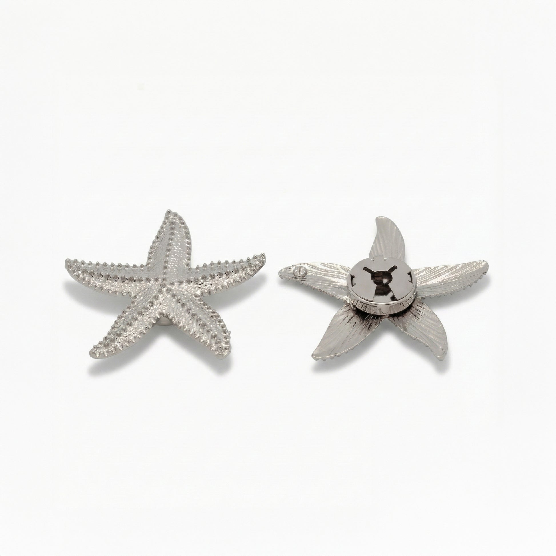 A bold, ocean-inspired button cover that brings instant seaside elegance to any outfit. Featuring a textured starfish design with a polished metallic finish, it snaps over your existing button for a quick, stylish upgrade. Reusable, lightweight, and statement-making.